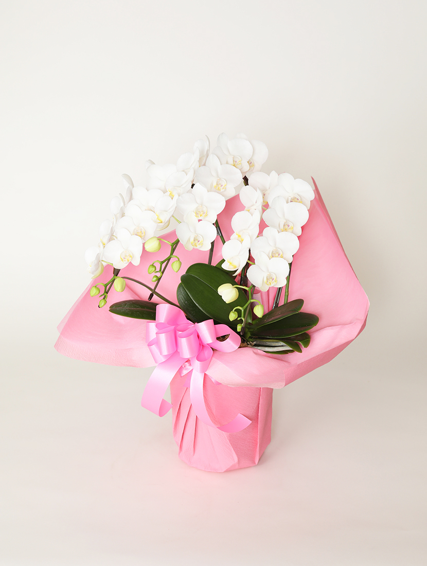 6種類の色鮮やかなラッピングを、全て無料でサービスしておりますので、お好みのお色を選んで頂けます。オプションにてさらに豪華に見えるラッピングもご用意しております。綺麗にラッピングされた胡蝶蘭は、花部を丁寧に包み、お祝い先様までお届けいたします。
