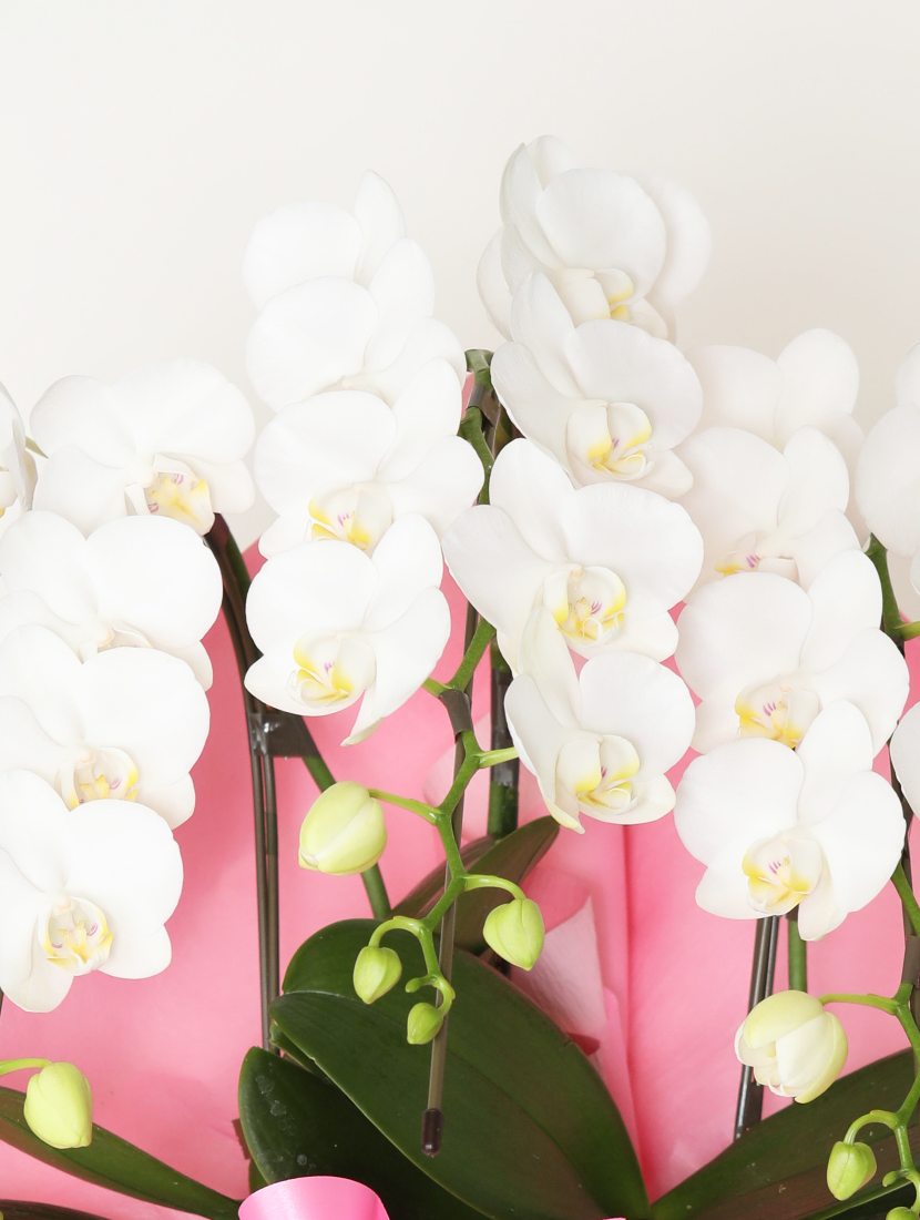 6種類の色鮮やかなラッピングを、全て無料でサービスしておりますので、お好みのお色を選んで頂けます。オプションにてさらに豪華に見えるラッピングもご用意しております。綺麗にラッピングされた胡蝶蘭は、花部を丁寧に包み、お祝い先様までお届けいたします。